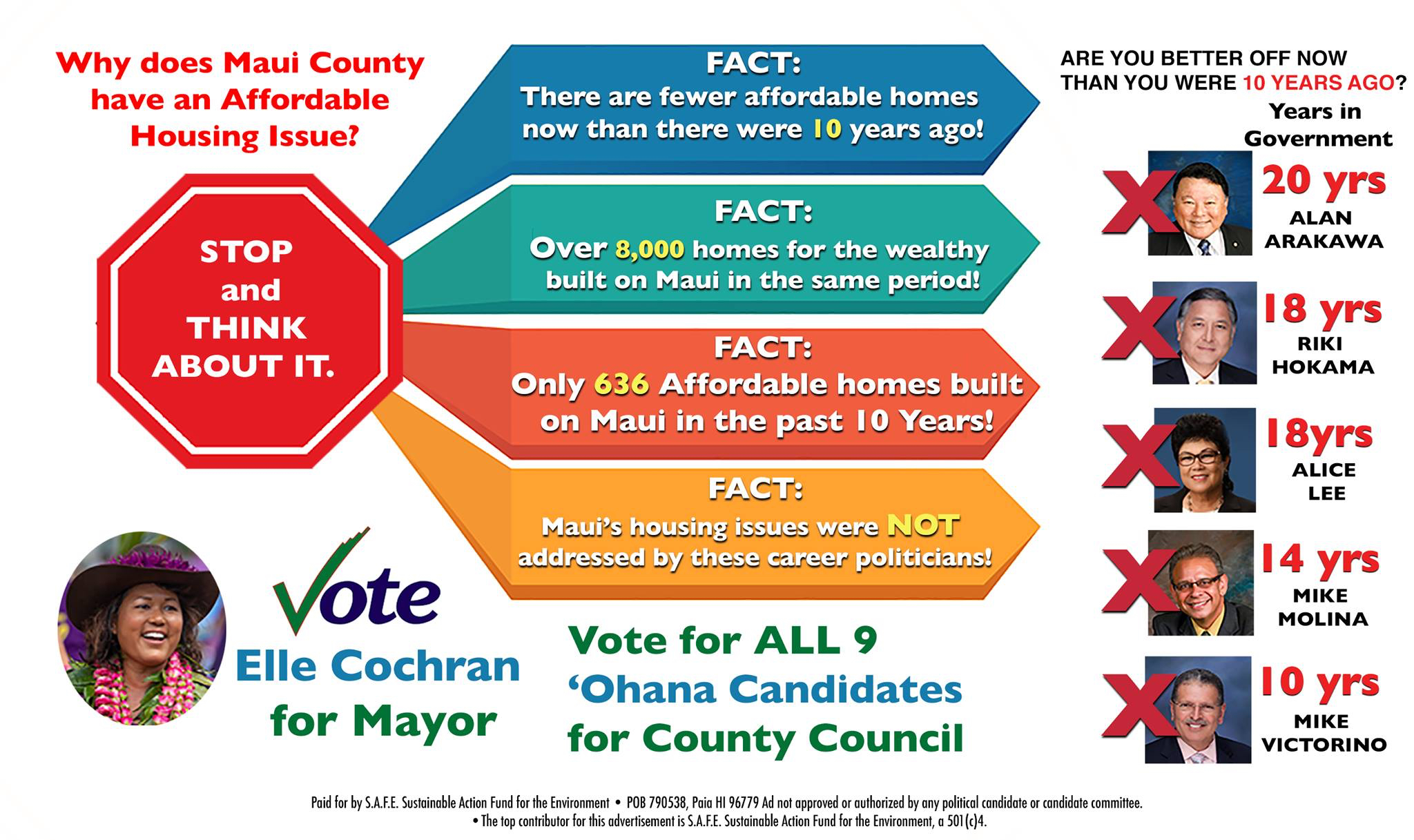 “Elle,” as she is widely known, makes no secret of her intention of sweeping away a plantation-mentality local power structure that she believes has supported runaway development and stifles meaningful change. A threat to the power elite, she has refused major developer campaign donations while bravely exposing corruption, lifting the lid on the entrenched system which has run Maui’s county government for decades.