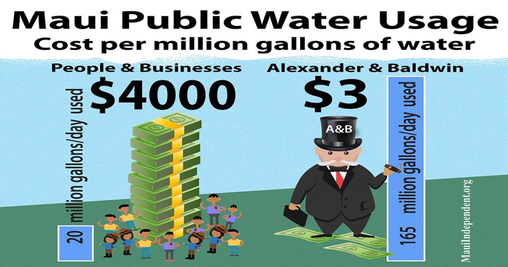 As previously reported here in The Maui Independent  the volume of public water that A&B used for its sugar plantations for decades would have cost a regular farmer, such as a native Hawaiian growing a traditional food crop to enhance food sovereignty, roughly $40 million a year. The price for the largest and wealthiest land development corporation in the state of Hawai‘i under the current state-sanctioned water giveaway:  just $180,000 per year, or far less than 1% of its market value.
