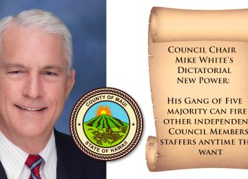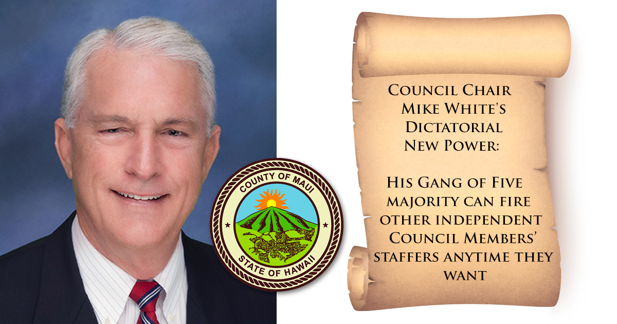 Maui Council Chair Mike White Seeks New Dictatorial Powers Friday 9 a.m. Hearing to Vote on New Law Empowering the Ruling Gang of Five to Fire Staffers Hired by Independent Council Members