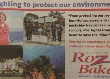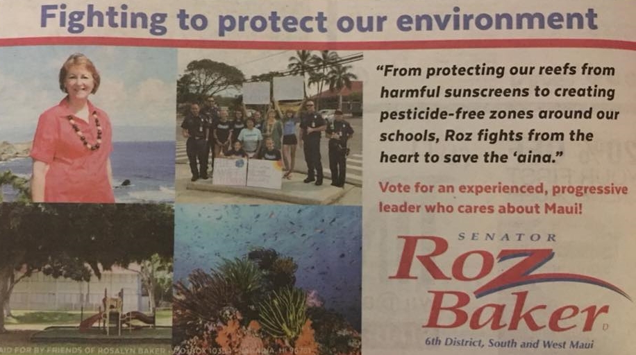 Almost Orwellian in its doublespeak deception, Maui Senator Roz Baker’s latest campaign ad promotes her as a champion of ‘aina protection. “From protecting our reefs from harmful sunscreens to creating pesticide free zones around our schools, Roz fights from the heart to save the ‘aina,” it reads. The truth? While she has taken credit for